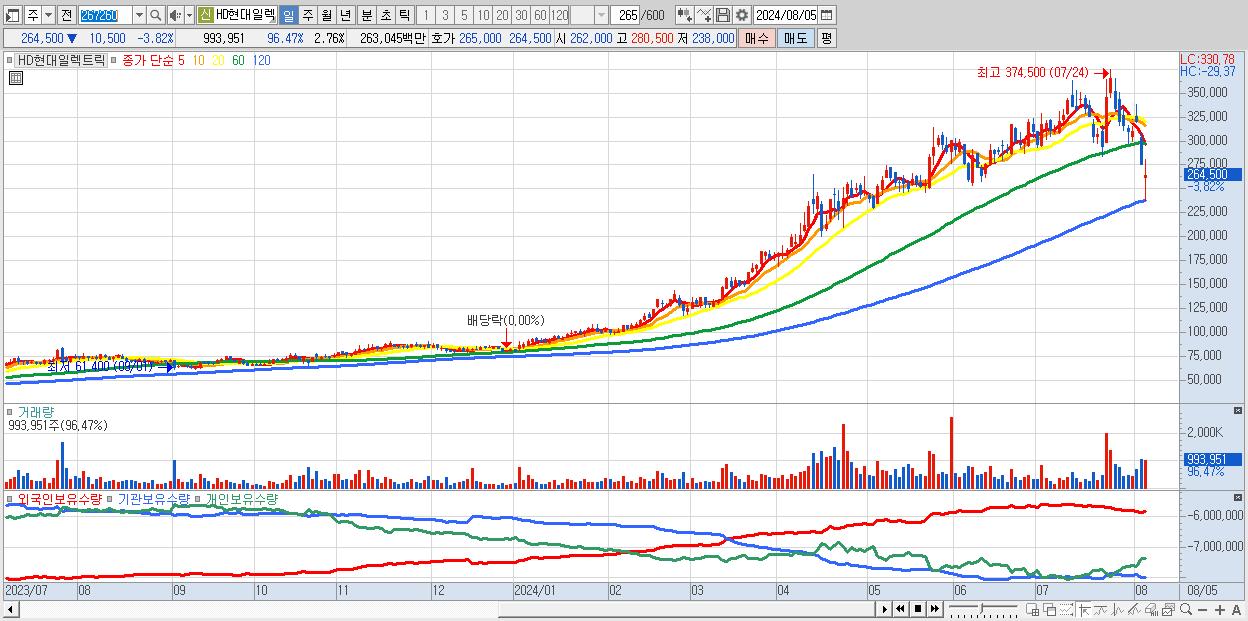 - HD현대일렉트릭 (264,500원 ▼ -3.82% , 시총: 95,345억, 거래량: 993,951, 거래대금:2,630억)