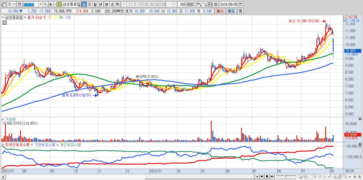 - 삼성중공업 (10,050원 ▼ -11.06% , 시총: 88,440억, 거래량: 19,668,979, 거래대금:2,023억)