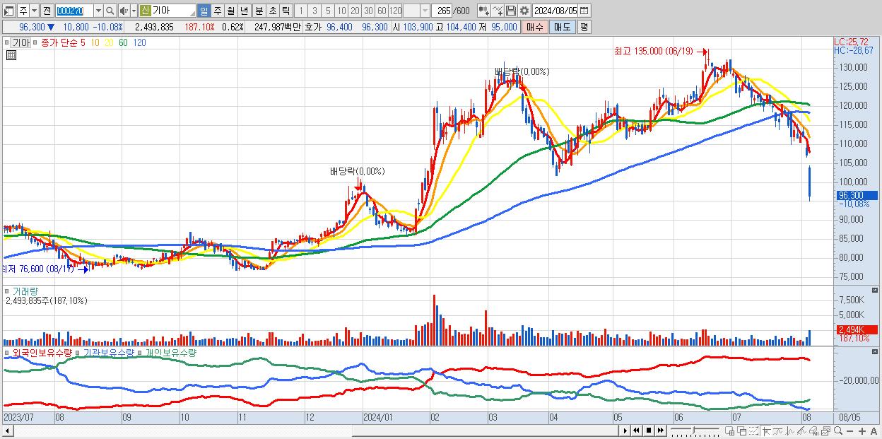 - 기아 (96,300원 ▼ -10.08% , 시총: 385,064억, 거래량: 2,493,835, 거래대금:2,480억)