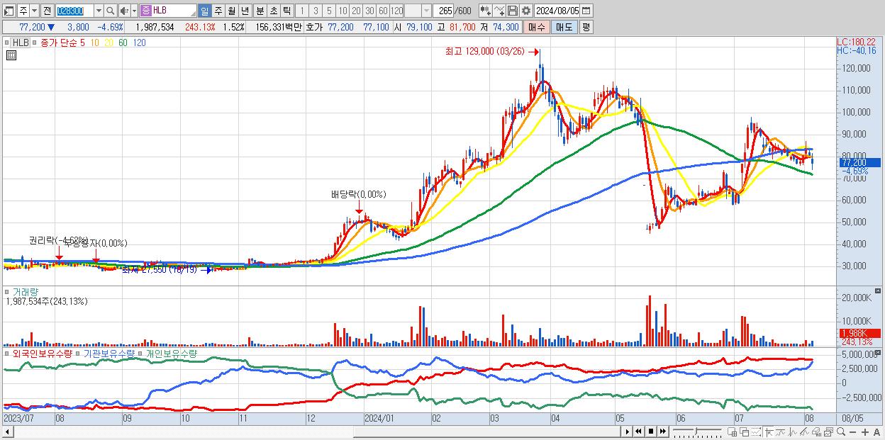 - HLB (77,200원 ▼ -4.69% , 시총: 101,013억, 거래량: 1,987,534, 거래대금:1,563억)
