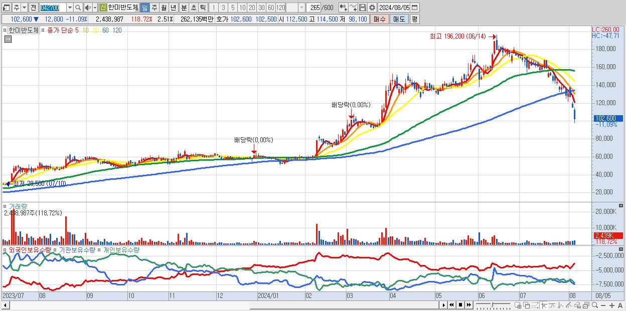 - 한미반도체 (102,600원 ▼ -11.09% , 시총: 99,515억, 거래량: 2,438,987, 거래대금:2,621억)
