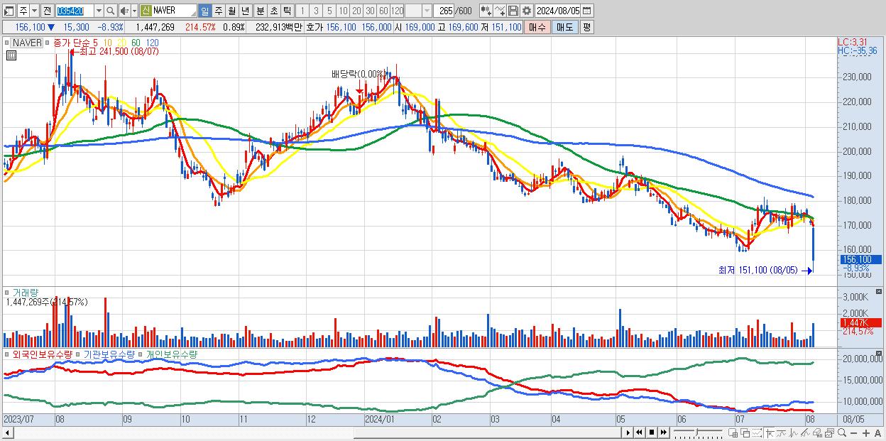 - NAVER (156,100원 ▼ -8.93% , 시총: 253,520억, 거래량: 1,447,269, 거래대금:2,329억)