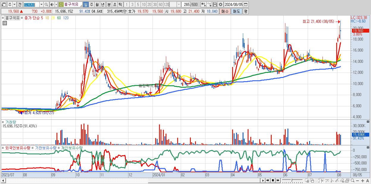 - 흥구석유 (19,560원 ▲ 3.88% , 시총: 2,934억, 거래량: 15,696,152, 거래대금:3,155억)