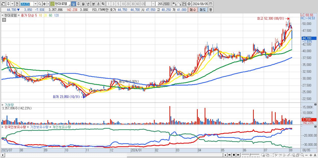 - 현대로템 (44,700원 ▼ -7.93% , 시총: 48,787억, 거래량: 3,357,896, 거래대금:1,532억)