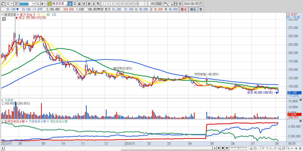 - 에코프로 (81,100원 ▼ -11.07% , 시총: 107,975억, 거래량: 2,169,450, 거래대금:1,881억)