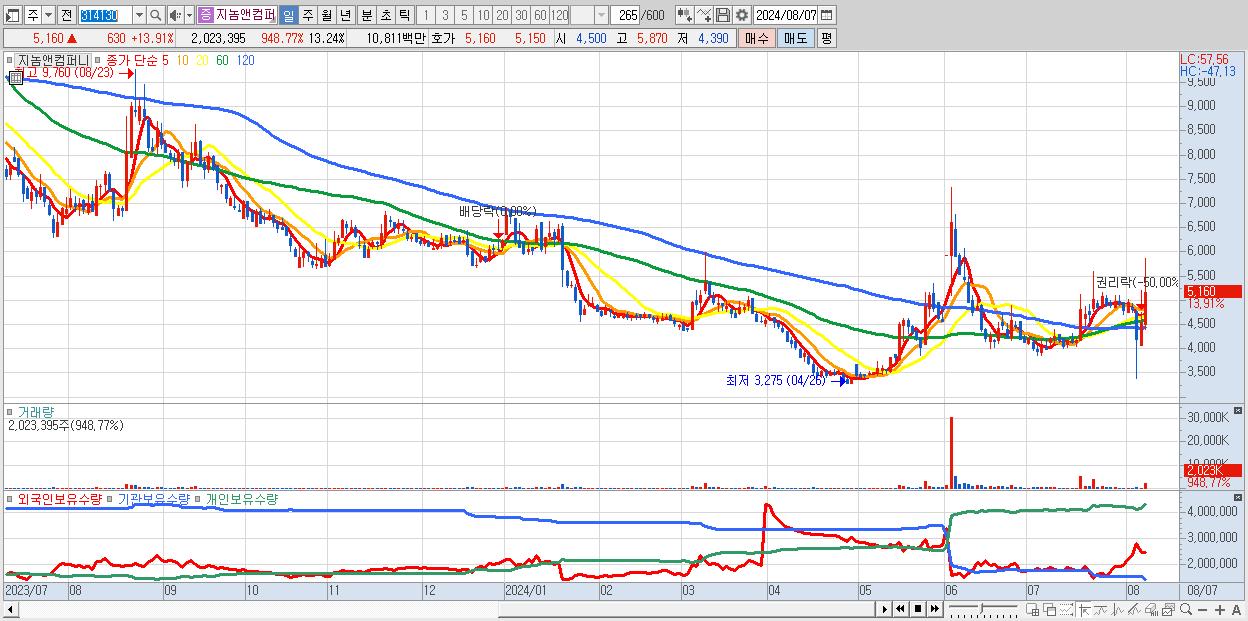 - 지놈앤컴퍼니 (5,160원 ▲ 13.91% , 시총: 789억, 거래량: 2,023,395, 거래대금:108억)