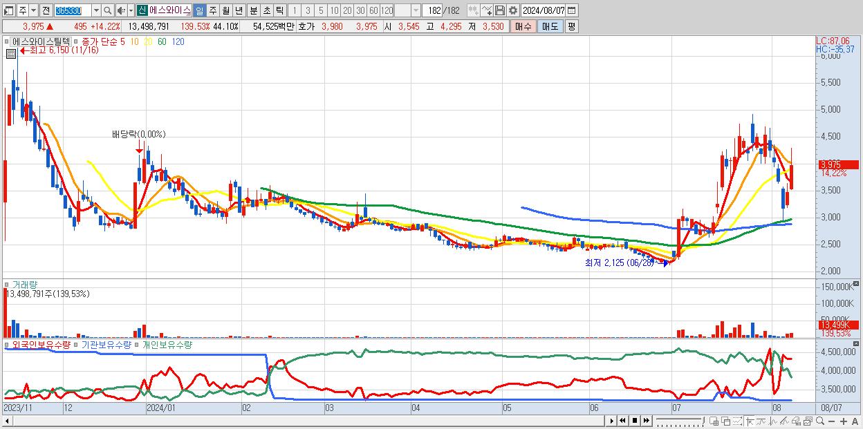 - 에스와이스틸텍 (3,975원 ▲ 14.22% , 시총: 1,217억, 거래량: 13,498,791, 거래대금:545억)