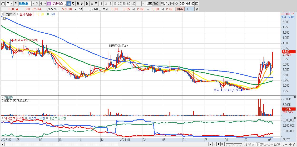 - 유틸렉스 (3,600원 ▲ 27.66% , 시총: 1,325억, 거래량: 2,925,979, 거래대금:96억)