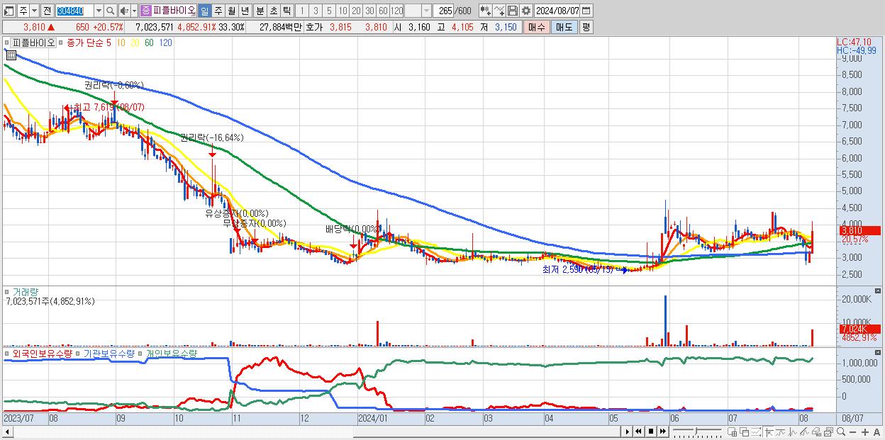 - 피플바이오 (3,810원 ▲ 20.57% , 시총: 804억, 거래량: 7,023,571, 거래대금:279억)