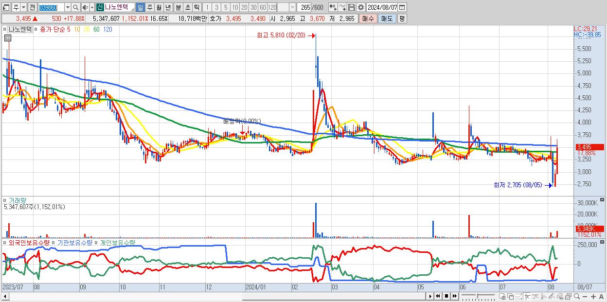 - 나노엔텍 (3,495원 ▲ 17.88% , 시총: 1,122억, 거래량: 5,347,607, 거래대금:187억)