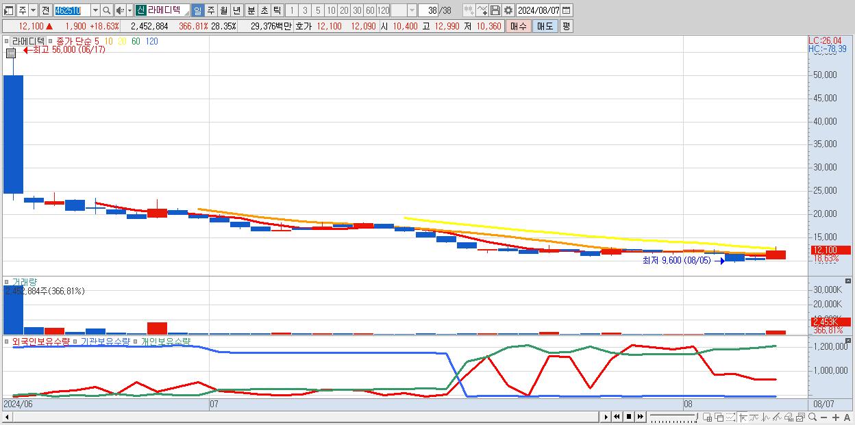 - 라메디텍 (12,100원 ▲ 18.63% , 시총: 1,047억, 거래량: 2,452,884, 거래대금:294억)