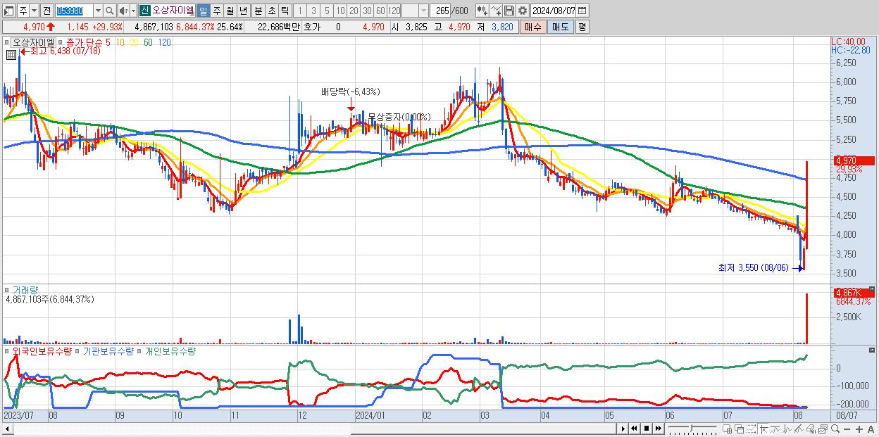 - 오상자이엘 (4,970원 ▲ 29.93% , 시총: 943억, 거래량: 4,867,103, 거래대금:227억)