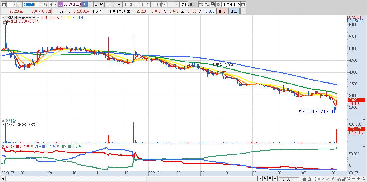 - SBI핀테크솔루션즈 (2,820원 ▲ 16.05% , 시총: 678억, 거래량: 377,437, 거래대금:11억)