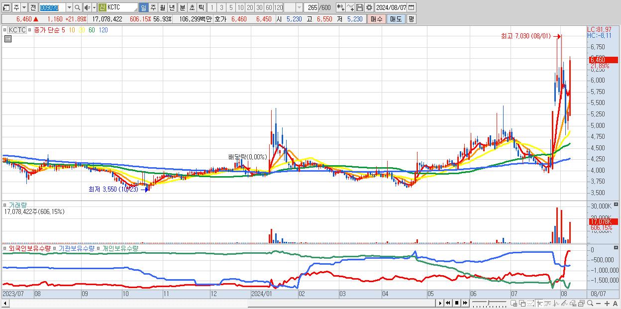 - KCTC (6,460원 ▲ 21.89% , 시총: 1,938억, 거래량: 17,078,422, 거래대금:1,063억)
