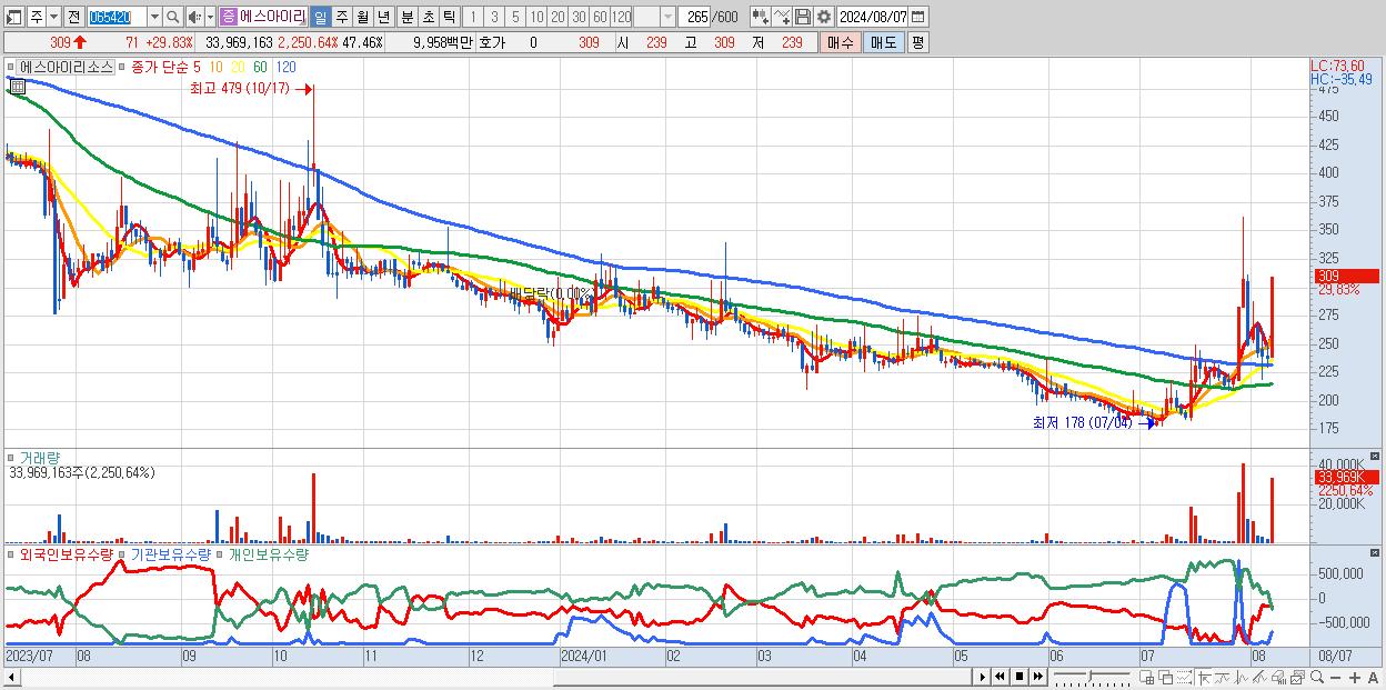 - 에스아이리소스 (309원 ▲ 29.83% , 시총: 221억, 거래량: 33,969,163, 거래대금:100억)