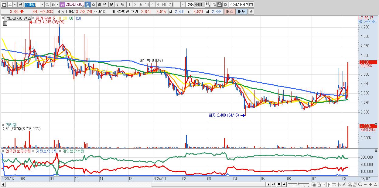 - 압타머사이언스 (3,820원 ▲ 29.93% , 시총: 649억, 거래량: 4,501,987, 거래대금:166억)