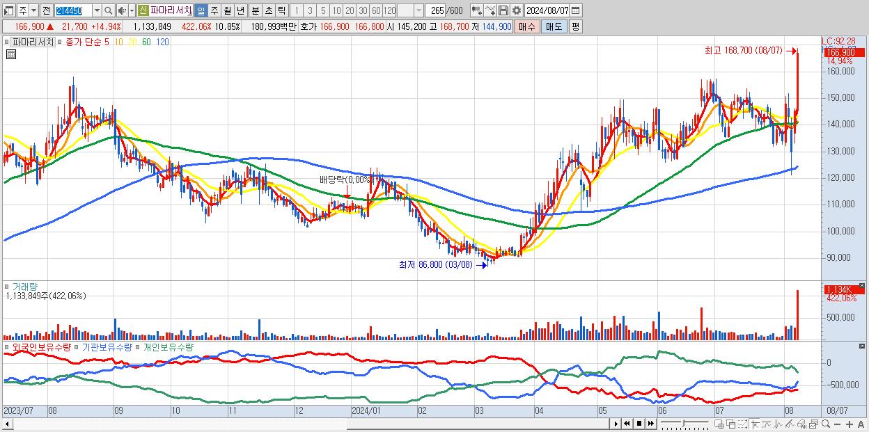 - 파마리서치 (166,900원 ▲ 14.94% , 시총: 17,446억, 거래량: 1,133,849, 거래대금:1,810억)