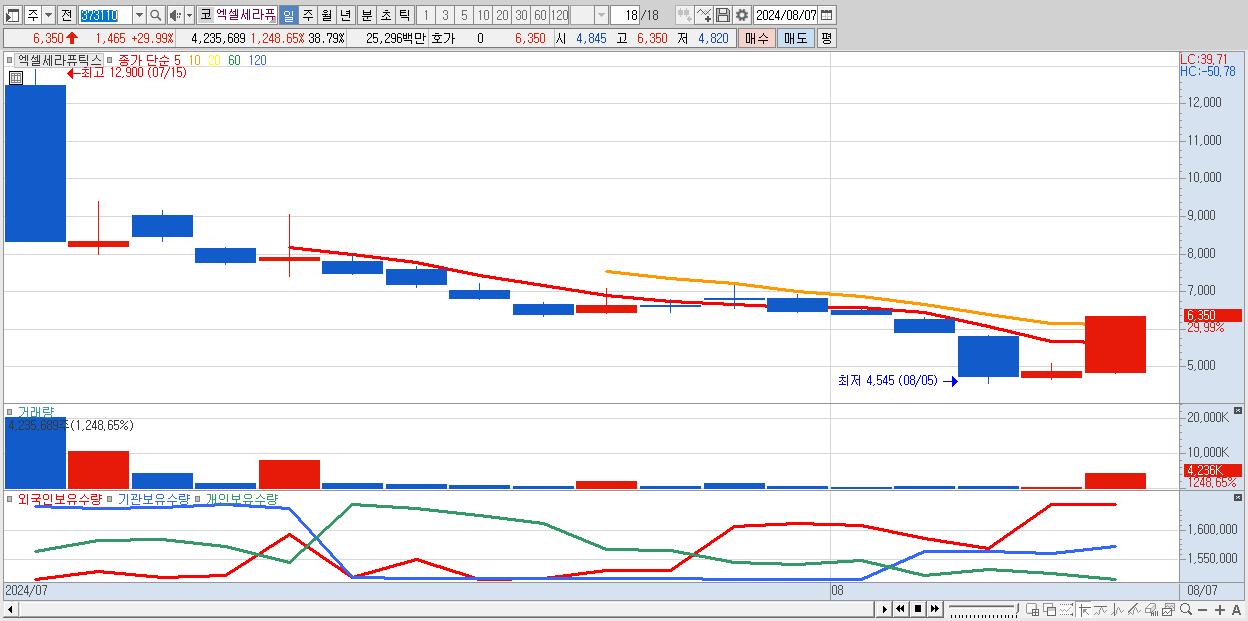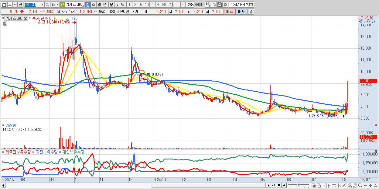 - 엑셀세라퓨틱스 (6,350원 ▲ 29.99% , 시총: 693억, 거래량: 4,235,689, 거래대금:253억)