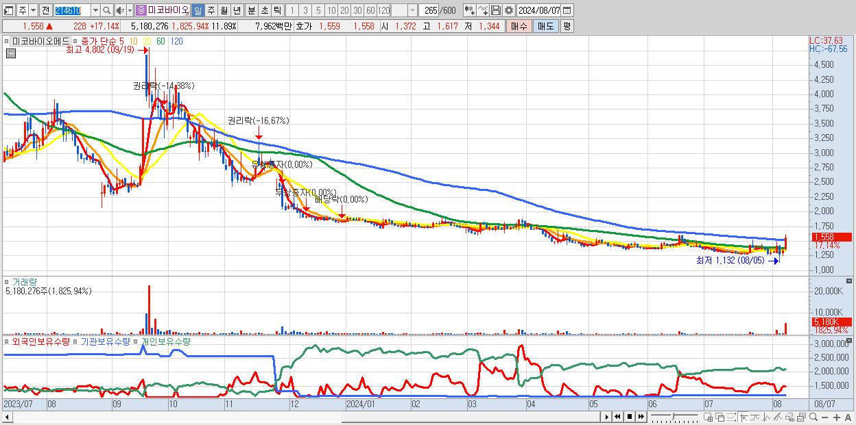 - 미코바이오메드 (1,558원 ▲ 17.14% , 시총: 679억, 거래량: 5,180,276, 거래대금:80억)