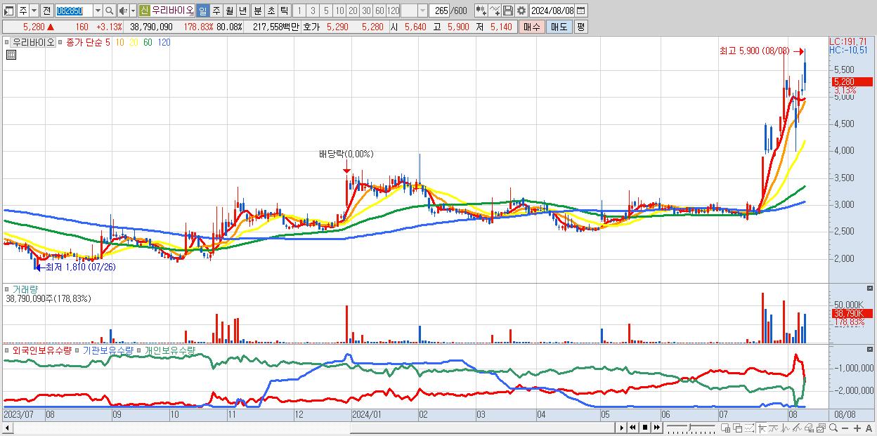- 우리바이오 (5,280원 ▲ 3.13% , 시총: 2,557억, 거래량: 38,790,090, 거래대금:2,176억)