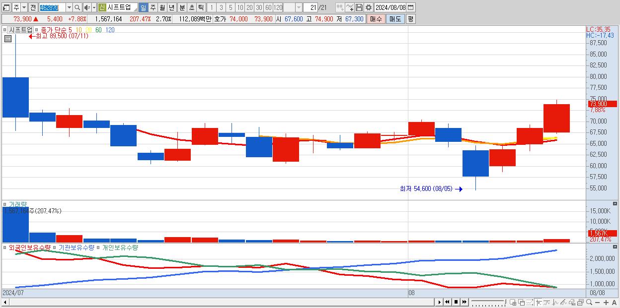 - 시프트업 (73,900원 ▲ 7.88% , 시총: 42,881억, 거래량: 1,567,164, 거래대금:1,121억)