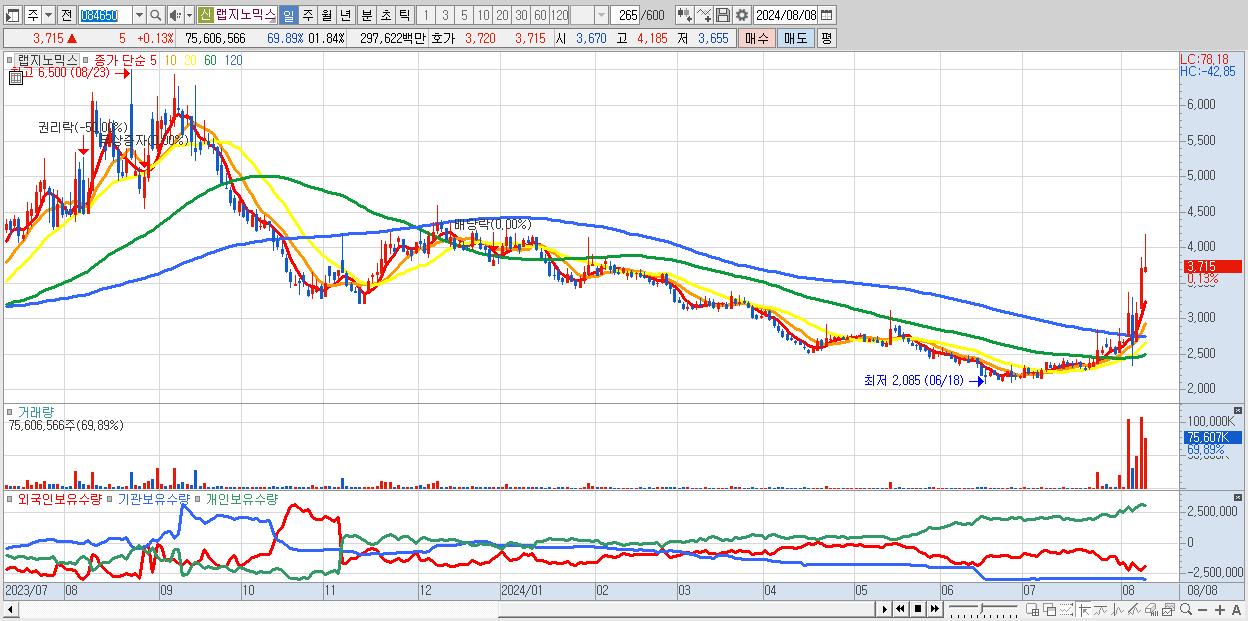 - 랩지노믹스 (3,715원 ▲ 0.13% , 시총: 2,758억, 거래량: 75,606,566, 거래대금:2,976억)