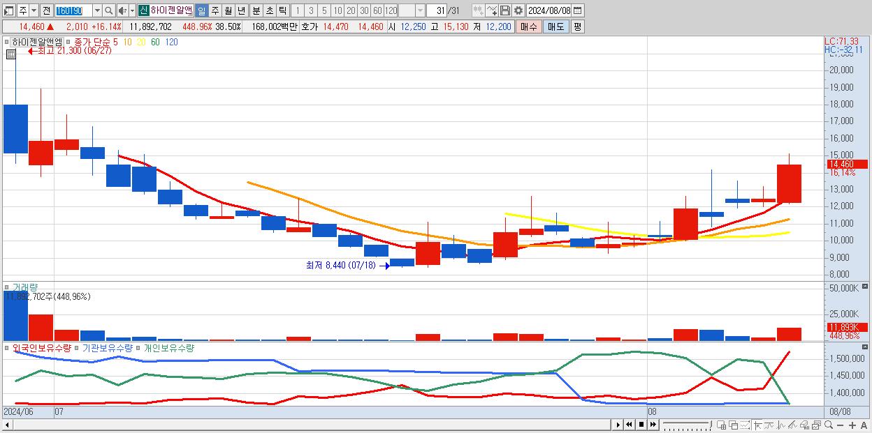 - 하이젠알앤엠 (14,460원 ▲ 16.14% , 시총: 4,466억, 거래량: 11,892,702, 거래대금:1,680억)