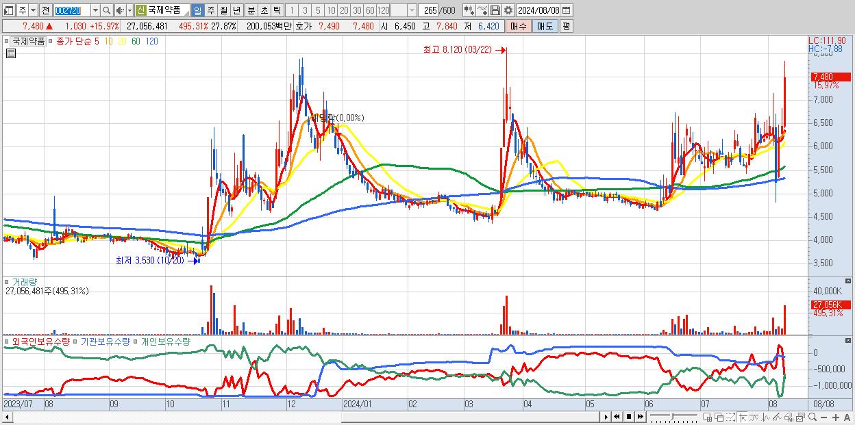 - 국제약품 (7,480원 ▲ 15.97% , 시총: 1,583억, 거래량: 27,056,481, 거래대금:2,001억)