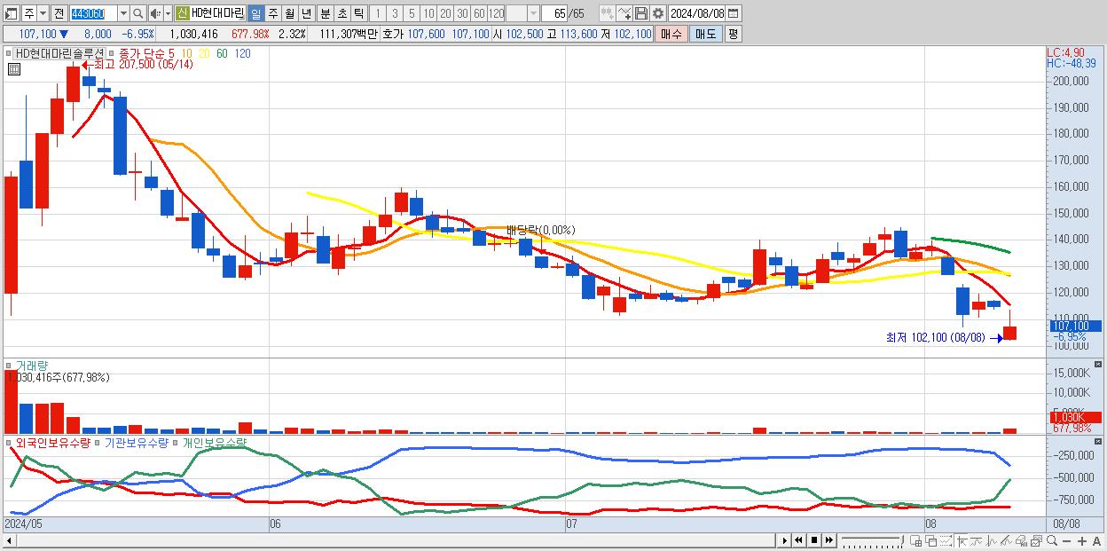 - HD현대마린솔루션 (107,100원 ▼ -6.95% , 시총: 47,606억, 거래량: 1,030,416, 거래대금:1,113억)