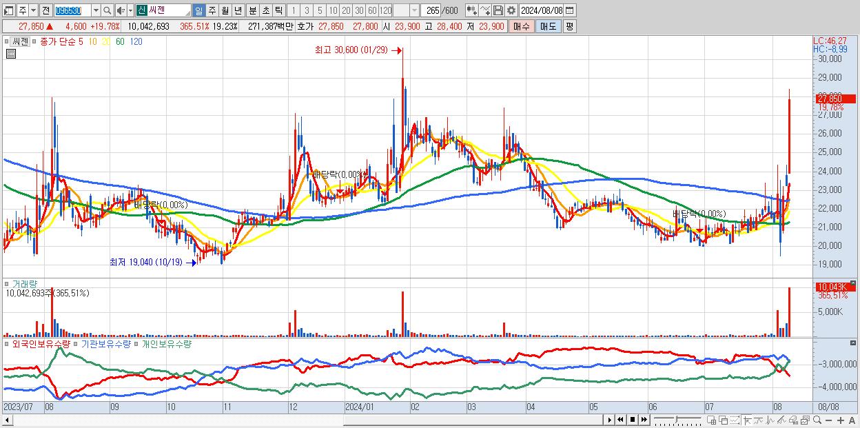 - 씨젠 (27,850원 ▲ 19.78% , 시총: 14,545억, 거래량: 10,042,693, 거래대금:2,714억)