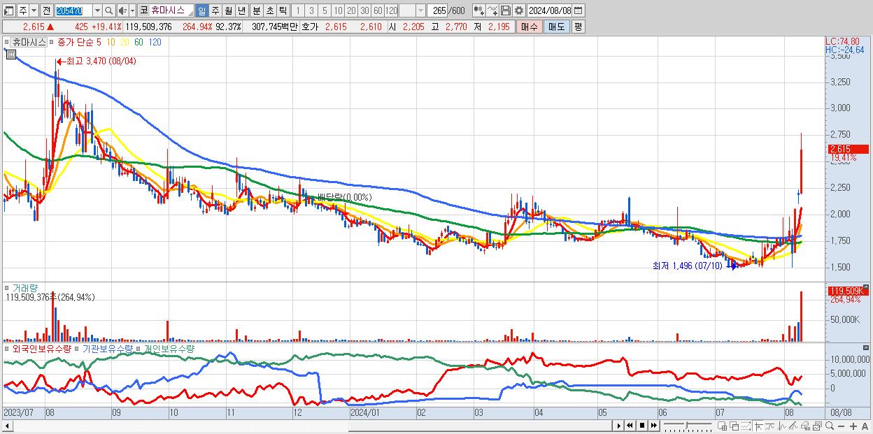 - 휴마시스 (2,615원 ▲ 19.41% , 시총: 3,383억, 거래량: 119,509,376, 거래대금:3,077억)