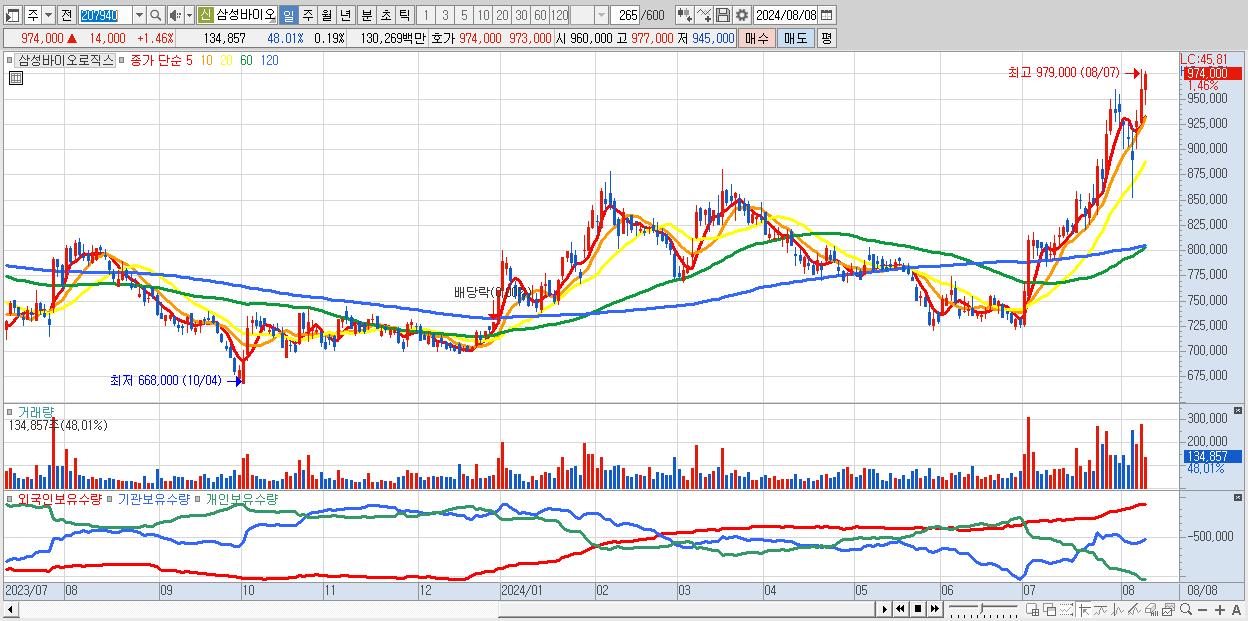 - 삼성바이오로직스 (974,000원 ▲ 1.46% , 시총: 693,235억, 거래량: 134,857, 거래대금:1,303억)
