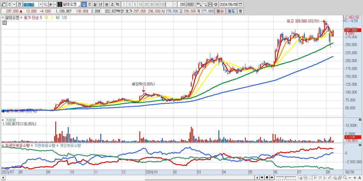 - 알테오젠 (297,000원 ▲ 4.58% , 시총: 157,851억, 거래량: 1,109,967, 거래대금:3,226억)