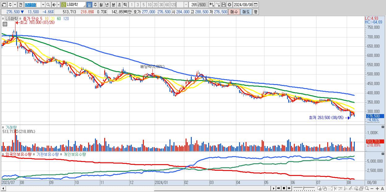 - LG화학 (276,500원 ▼ -4.66% , 시총: 195,188억, 거래량: 513,713, 거래대금:1,429억)