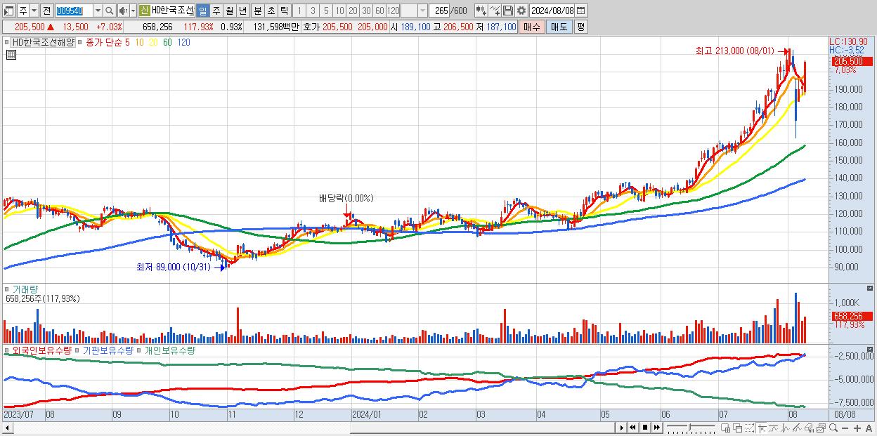 - HD한국조선해양 (205,500원 ▲ 7.03% , 시총: 145,439억, 거래량: 658,256, 거래대금:1,316억)