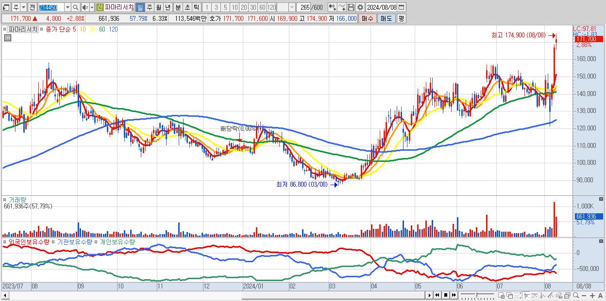 - 파마리서치 (171,700원 ▲ 2.88% , 시총: 17,947억, 거래량: 661,936, 거래대금:1,135억)