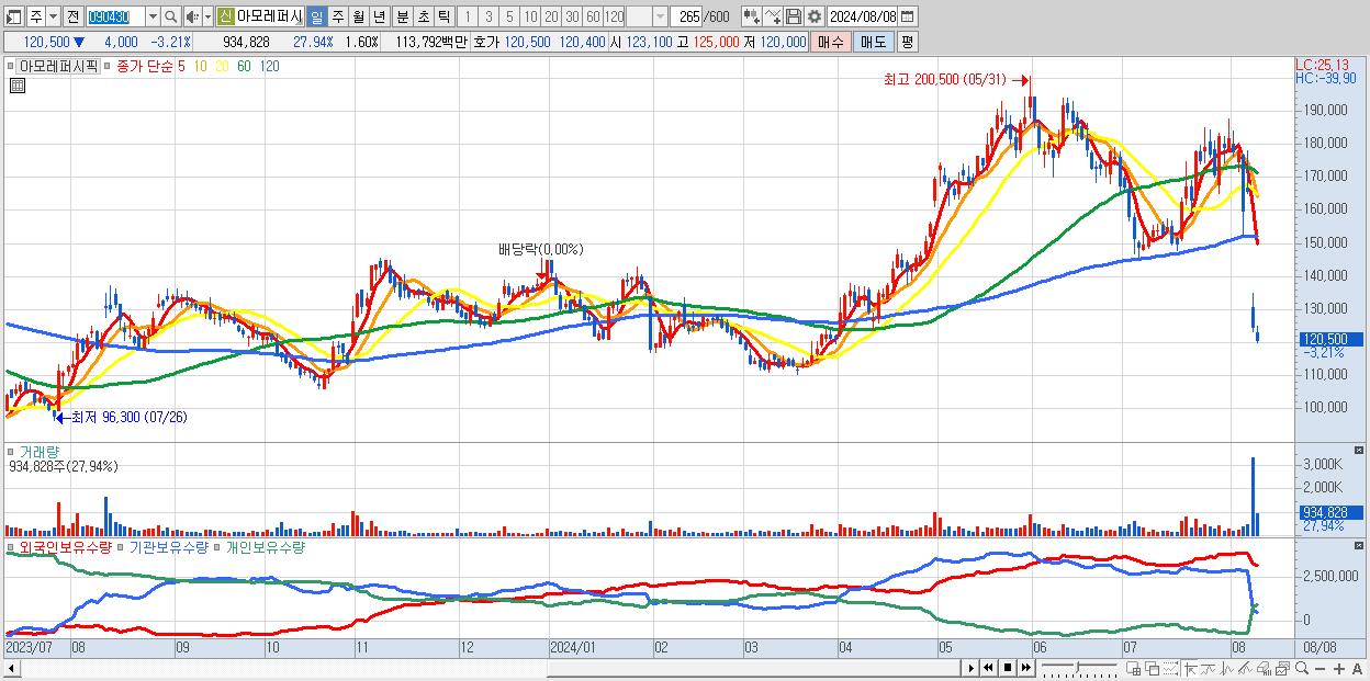 - 아모레퍼시픽 (120,500원 ▼ -3.21% , 시총: 70,484억, 거래량: 934,828, 거래대금:1,138억)