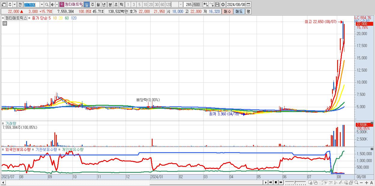 - 퀀타매트릭스 (22,000원 ▲ 15.79% , 시총: 3,638억, 거래량: 7,559,384, 거래대금:1,385억)