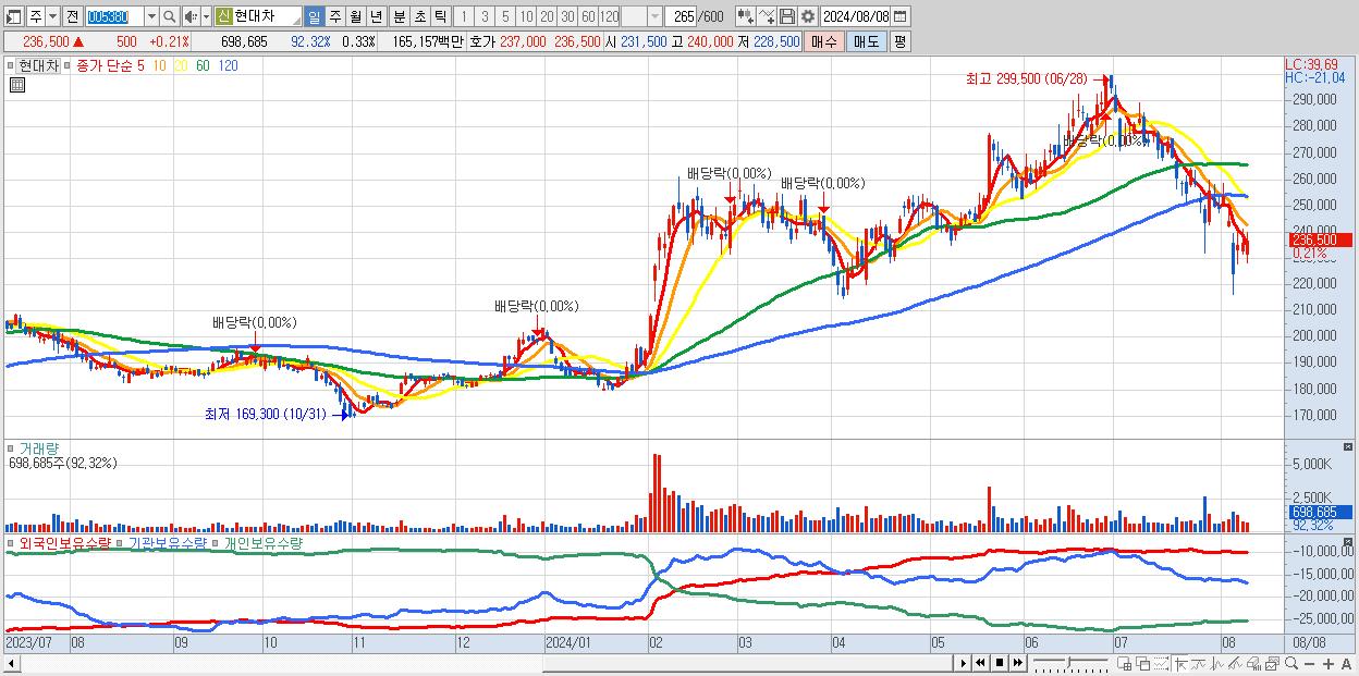 - 현대차 (236,500원 ▲ 0.21% , 시총: 495,269억, 거래량: 698,685, 거래대금:1,652억)