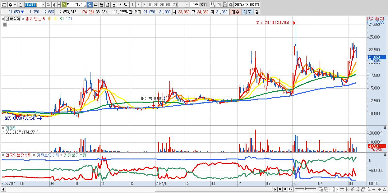 - 한국석유 (21,050원 ▼ -7.68% , 시총: 2,672억, 거래량: 4,853,313, 거래대금:1,113억)