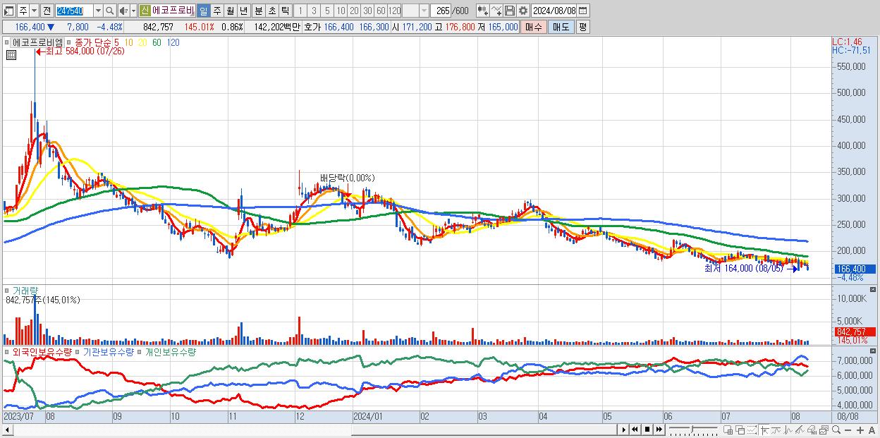- 에코프로비엠 (166,400원 ▼ -4.48% , 시총: 162,741억, 거래량: 842,757, 거래대금:1,422억)