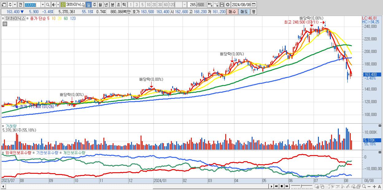 - SK하이닉스 (163,400원 ▼ -3.48% , 시총: 1,189,556억, 거래량: 5,370,361, 거래대금:8,801억)