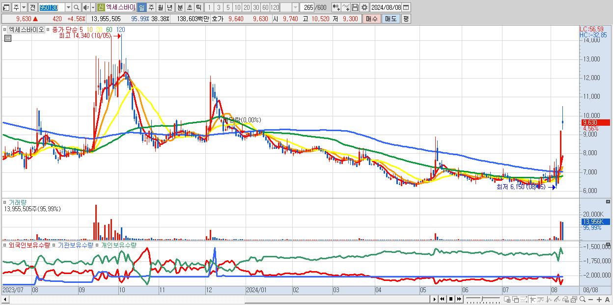 - 엑세스바이오 (9,630원 ▲ 4.56% , 시총: 3,502억, 거래량: 13,955,505, 거래대금:1,386억)