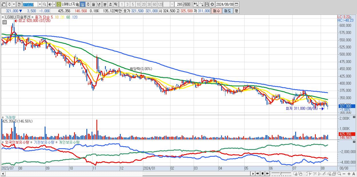 - LG에너지솔루션 (321,000원 ▼ -1.08% , 시총: 751,140억, 거래량: 425,356, 거래대금:1,351억)