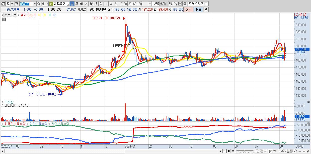 - 셀트리온 (195,700원 ▼ -0.66% , 시총: 424,656억, 거래량: 1,366,838, 거래대금:2,672억)