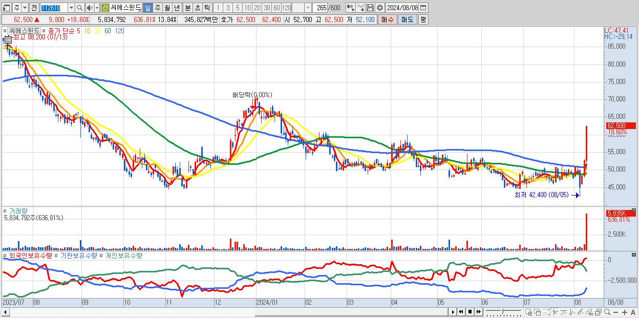 - 씨에스윈드 (62,500원 ▲ 18.6% , 시총: 26,357억, 거래량: 5,834,792, 거래대금:3,458억)