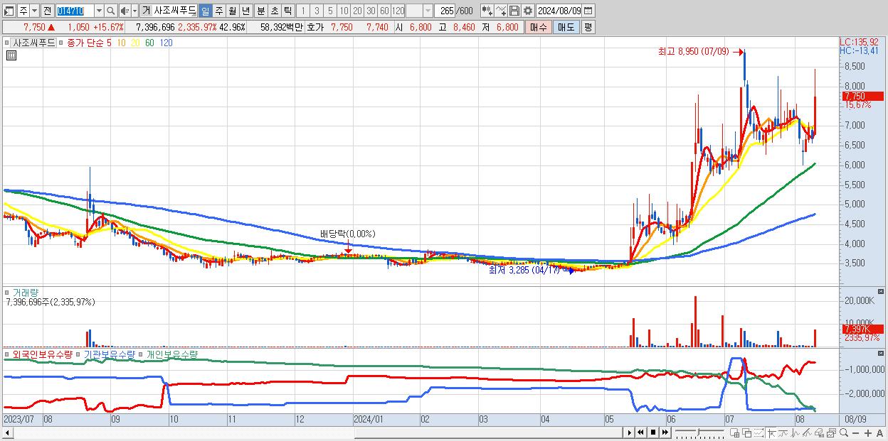 - 사조씨푸드 (7,750원 ▲ 15.67% , 시총: 1,334억, 거래량: 7,396,696, 거래대금:584억)