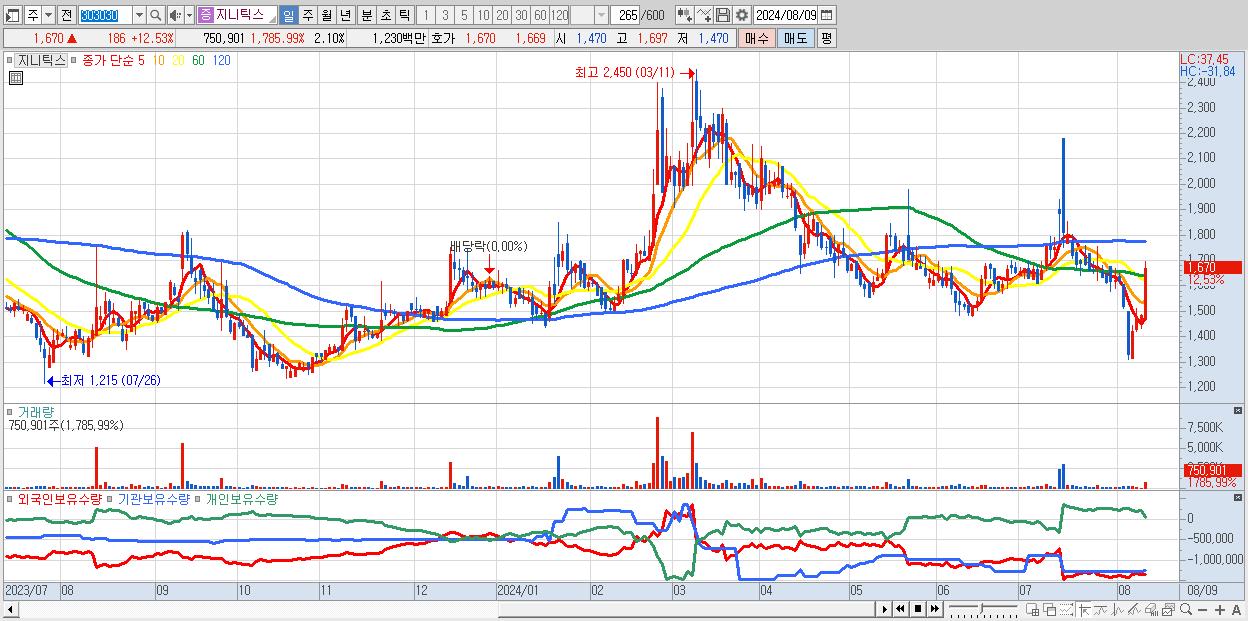 - 지니틱스 (1,670원 ▲ 12.53% , 시총: 597억, 거래량: 750,901, 거래대금:12억)