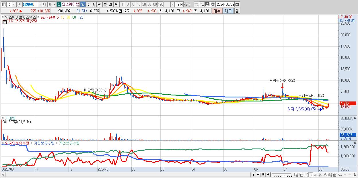- 인스웨이브시스템즈 (4,935원 ▲ 18.63% , 시총: 726억, 거래량: 981,397, 거래대금:45억)