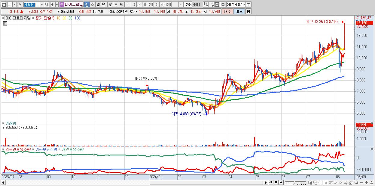 - 마이크로디지탈 (13,150원 ▲ 27.42% , 시총: 2,078억, 거래량: 2,955,560, 거래대금:367억)